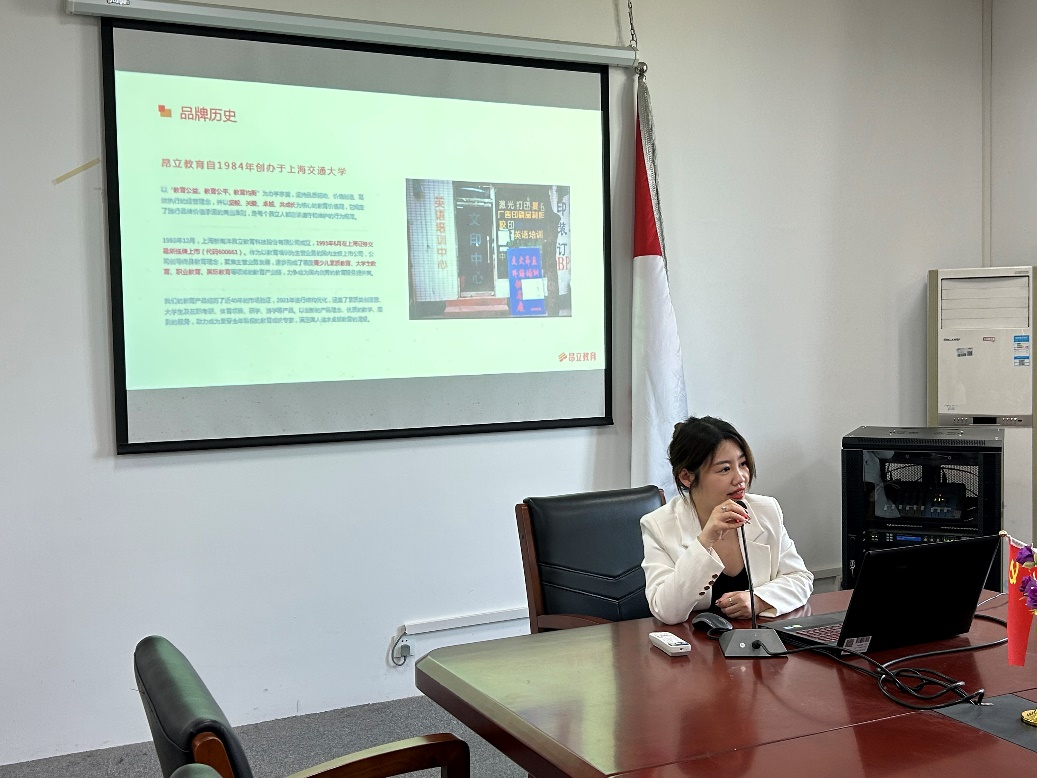 随后,昂立集团语言学院高级副院长王澍然就企业的品牌历史、主营业务等方面进行了分享,并详细地讲解了企业招聘岗位、入职后晋升发展路径以及薪资待遇和员工福利等方面信息,表达了公司在校企项目合作、人才培养、就业实习等领域与学院进行深化合作的意愿。