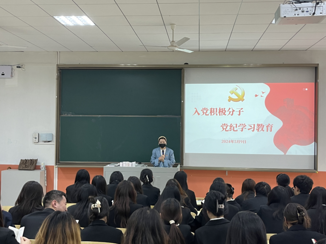2024年5月9日,外国语学院2024上半年入党积极分子培训班于三教120开展党纪学习教育。本次党纪学习教育分为两个部分,第一部分由外国语学院党委纪检委员刘沛雨为学员讲解开展党纪学习教育应弄清的三个基本问题;第二部全体学员逐章逐条学习《中国共产党纪律处分条例》。