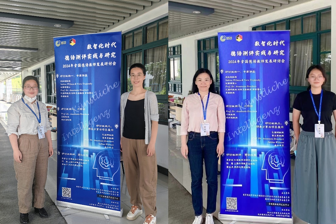 2024年5月24日至26日,上海建桥学院外国语学院德语系四位教师徐爽、赵健品、侯健慧、赵云敏赴浙江大学紫金港校区,参加了全国德语教师发展研讨会。本次研讨会以“数智化时代德语测评实践与研究”为主题,由教育部高等学校外国语文学类专业教学指导委员会德语专业教学指导分委员会全国德语教师发展中心主办,浙江大学德国文化研究所、北京德国文化中心·歌德学院(中国)承办,共有来自全国40多所高校的70余位嘉宾及教师参会。