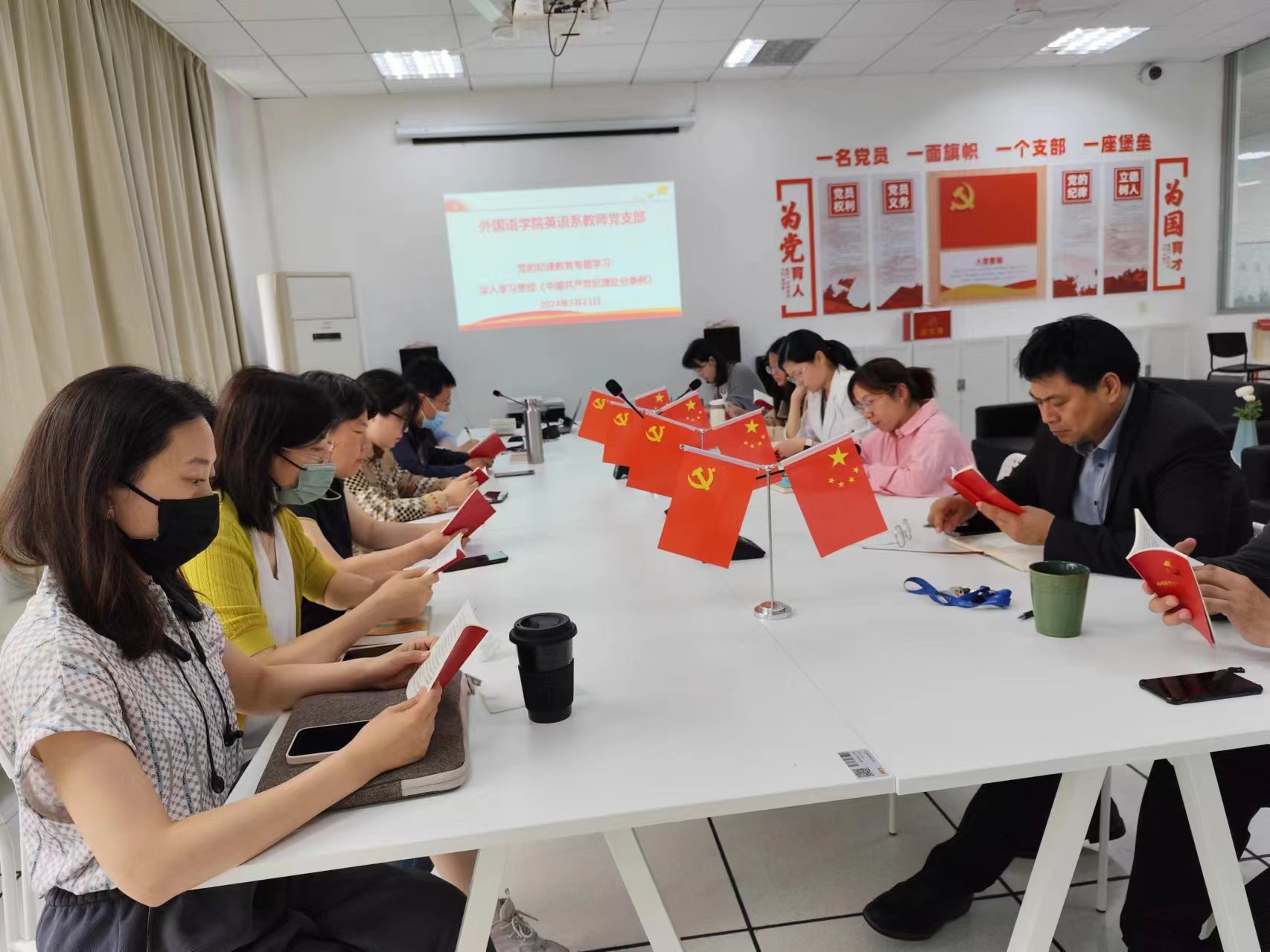 5月23日下午,外国语学院英语系教师党支部在外国语楼303室开展组织生活进行党纪学习,支部全体党员参加,会议由支部书记王君兰主持。