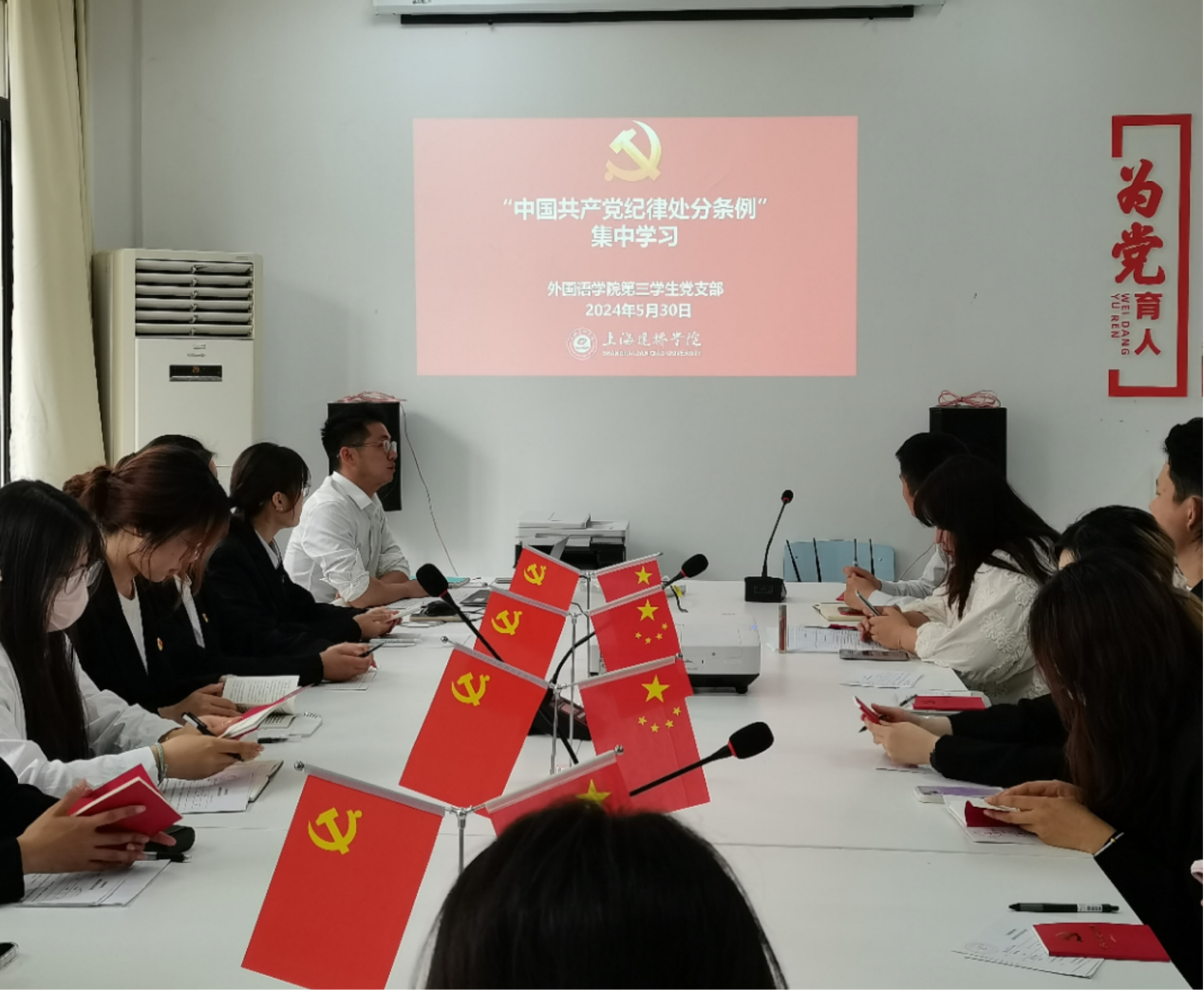 为进一步增强党员关于党纪的观念,督促党员同志在思想上不松懈、责任上不松动、行动上不松劲,做一名“讲党性、遵党章、守党纪”的共产党员。2024年5月30日下午,外国语学院第三学生党支部于外院303召开《中国共产党纪律处分条例》(以下简称条例)集中学习会。会议由第三学生党支部书记吴多发主持,全体师生党员参加会议。