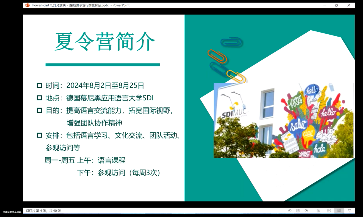 会议伊始,夏令营带队老师侯健慧对本次德国夏令营进行了整体介绍。侯老师概述了夏令营的基本信息,包括活动的时间、地点、目的和具体安排,确保各位学生及家长对夏令营活动有全面的了解,激发了学生们对即将到来的学习和文化体验的期待。
