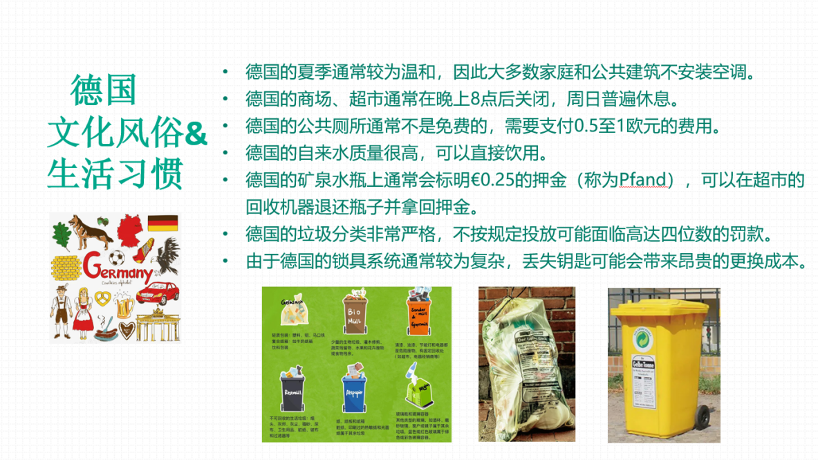 在出行准备方面,侯老师提醒学生携带护照及复印件,兑换小面值欧元现金、准备必要的药品、雨具、转换插头等日常用品,并详细讲解了出入境要求,包括入境德国需要携带的材料和禁止携带的物品。为了让学生提前对即将体验的生活环境有一个全面的了解,以便更好地适应和融入当地环境,侯老师详细介绍了德国慕尼黑的地域特色,包括当地的气候条件、文化风貌以及生活习俗。