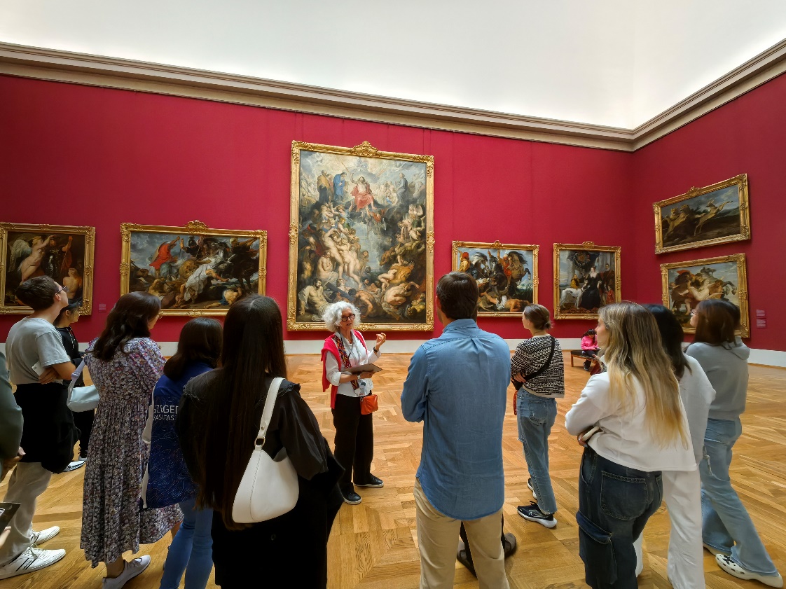 在慕尼黑老绘画陈列馆,学生们沉浸在从文艺复兴到现代的艺术发展历程中。在专业讲解的带领下,学生们欣赏了了伦勃朗、鲁本斯、梵高、莫奈等大师的经典之作,每一幅画作都是对一个时代精神的深刻诠释。这些艺术杰作不仅让学生们领略了艺术的细腻与力量,更在他们心中播下了对艺术史深入探索的种子。随后的伦巴赫美术馆之旅,为学生们的文化遗产探索增添了现代艺术的维度。这里展示的德国和欧洲现代艺术作品,让学生们得以近距离体验艺术的创新与活力,进一步点燃了他们对现代艺术的热情与思考。