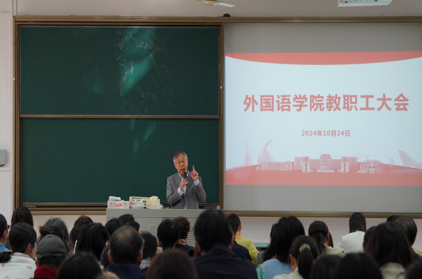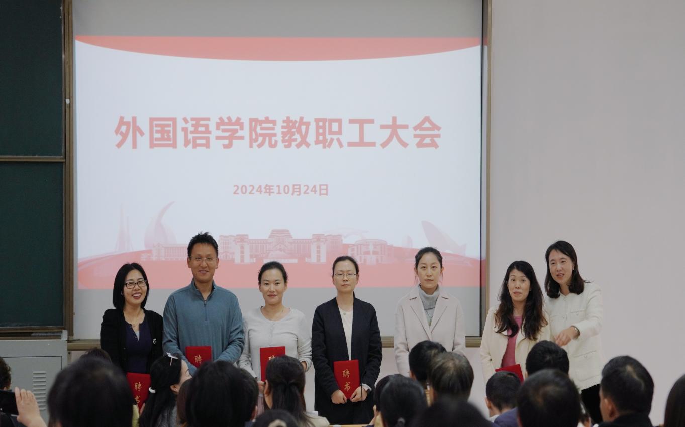 10月24日下午1:30,为持续推进外国语学院教学改革与质量提升工作的开展,外国语学院在3教120室召开全院教职工大会,院长毛立群、党委书记杜鹃、副书记伊莉、院长助理孔辉、陈银春以及外国语学院全体教职工参加了会议,会议由毛立群院长主持。
