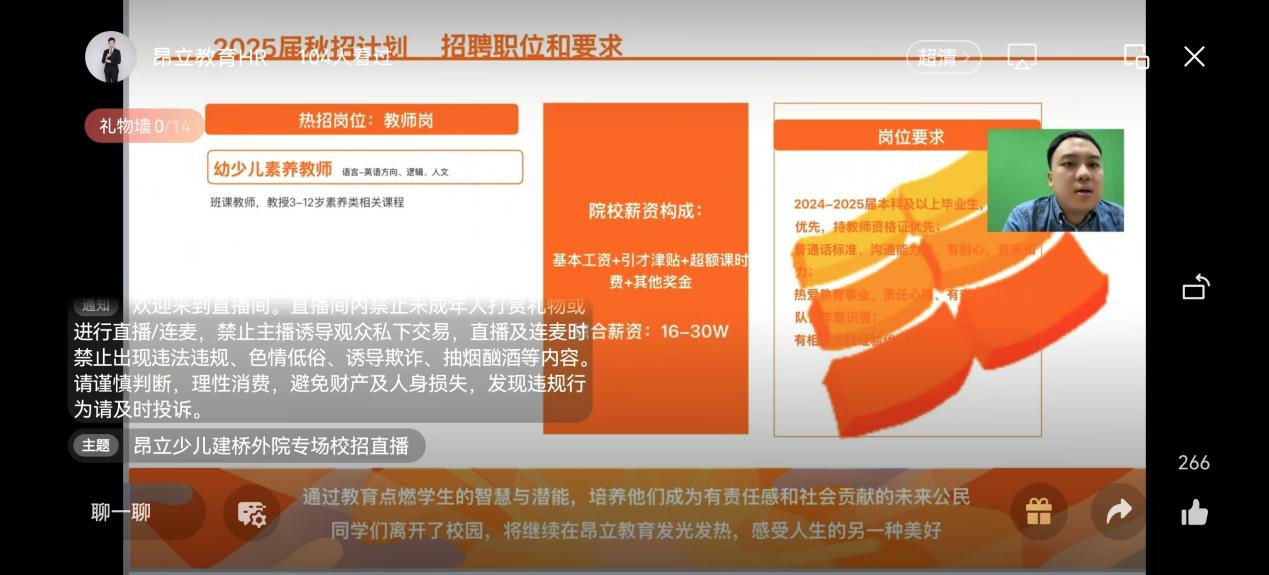 为切实做好2025届毕业生就业工作,构建毕业生与用人单位的交流平台,促进2025届毕业生高质量就业,我院于2024年10月31日晚上7点,邀请了我院校企合作单位上海昂立教育培训有限公司在微信直播上开展了招聘宣讲会。昂立校招负责人李源举、招聘主管高晓冬出席了本次宣讲,2025届毕业班辅导员、2025届毕业班学生112名学生参加,会议由学院就业横向工作负责人吴多发老师主持。