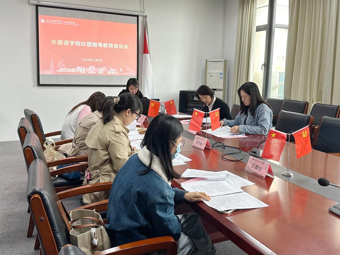 为深入学习贯彻习近平新时代中国特色社会主义思想和党的二十大精神,贯彻落实习近平总书记关于高校思想政治工作和青年工作的重要论述,切实加强学校学生社团建设管理,深化学生社团的学习与育人功能,推进学生社团健康有序发展。外国语学院于117日下午在229会议室召开社团指导教师座谈会。会议由党委书记杜鹃主持,党委副书记伊莉、分团委书记孟娣、社团指导教师周杨、刘雪飞、王嘉怡、胡雪梅出席了会议。