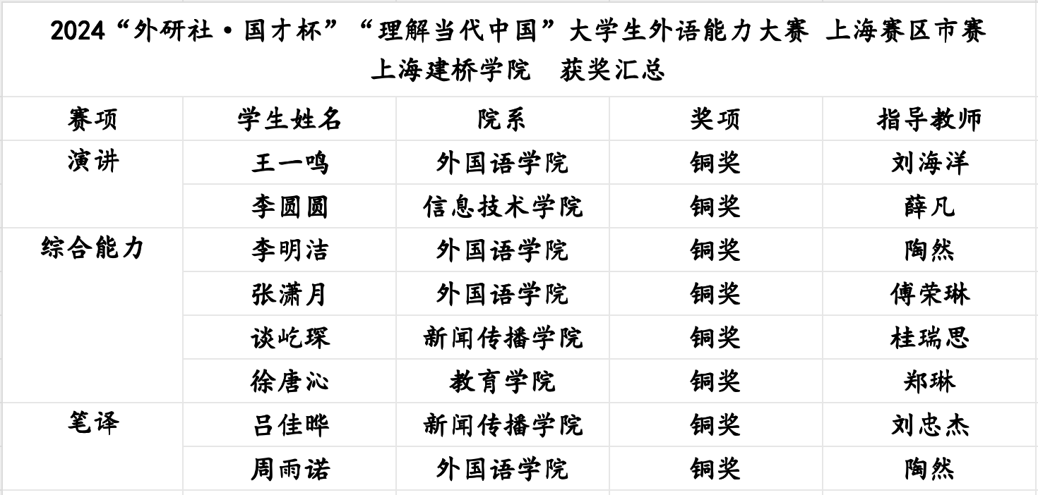 市赛阶段,八位选手展现出了不俗实力和无限潜力,用努力和才华书写了属于自己的精彩,也为学校争得了荣誉。他们的成绩不仅是个人努力的成果,也是上海建桥学院外语教学水平的有力体现。此次比赛结果彰显了我校学生在国际视野与本土情怀融合下的外语素养,值得庆贺。比赛是历练,也是成长的阶梯。相信经过此次磨练,建桥学子们定能总结经验,奋勇向前。期待在未来的赛事中,他们能带着更昂扬的斗志、更充分的准备,再次踏上征程,向着更高目标冲刺,绽放光彩,书写辉煌。