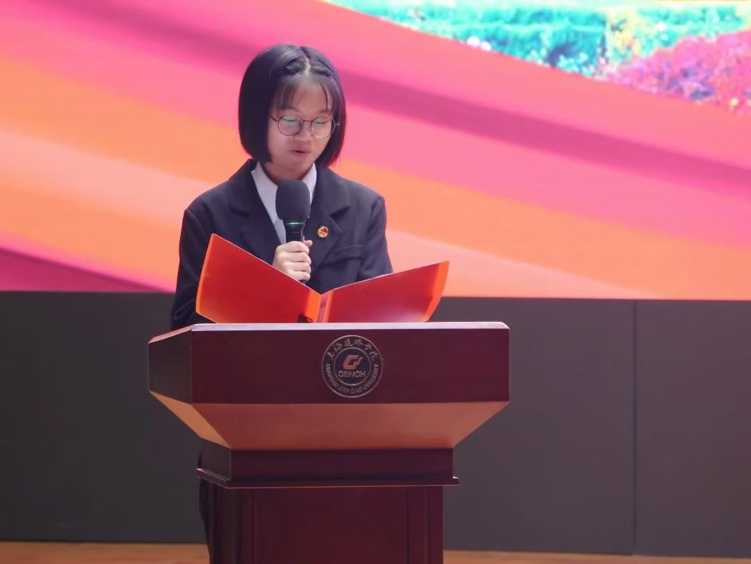会议最后,大会颁发学员结业证书,并对此次培训班中的优秀干部及学员进行表彰。外国语学院优秀干部程梦婷、优秀学员吕婕、张玉上台领奖。其中,张玉作为培训班优秀学员代表上台发言。她从党课学习、红色志愿服务以及自己自递交入党申请书以来一路的心路历程等方面向大家分享了学习感悟和收获体会。她强调,“在时代的浪潮中,我们每一个人都是推动社会进步的微小力量,我们肩负着传承红色基因、践行初心使命的重要职责。”她激情呼吁大家在学习实践中砥砺品格、增长才干,不仅做到组织上入党,更做到思想上入党。