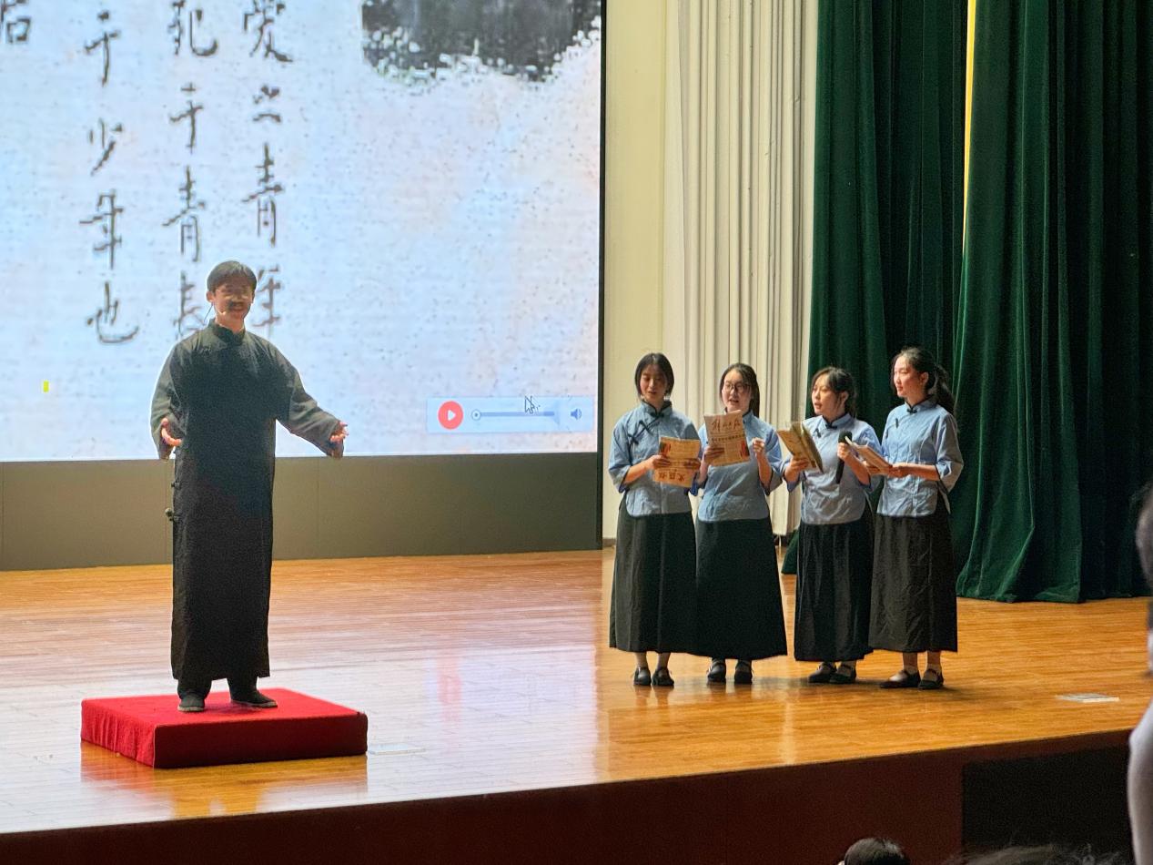 接下来各学院进行了学习汇报演出展示。此次汇报演出涵盖了“党史剧”、“三馆演讲”、“精神谱系”三种表演形式,每个学院都展现了精彩纷呈的表演。其中,外国语学院精心筹备的党史剧《以信仰之光,照亮青春之路》令人瞩目。该剧分为三幕,第一幕以1919年巴黎和会中国外交失败为背景,讲述了李大钊在《新青年》发表的文章激励有志青年奋进,鼓舞青年以青春之躯扛起救亡大旗。