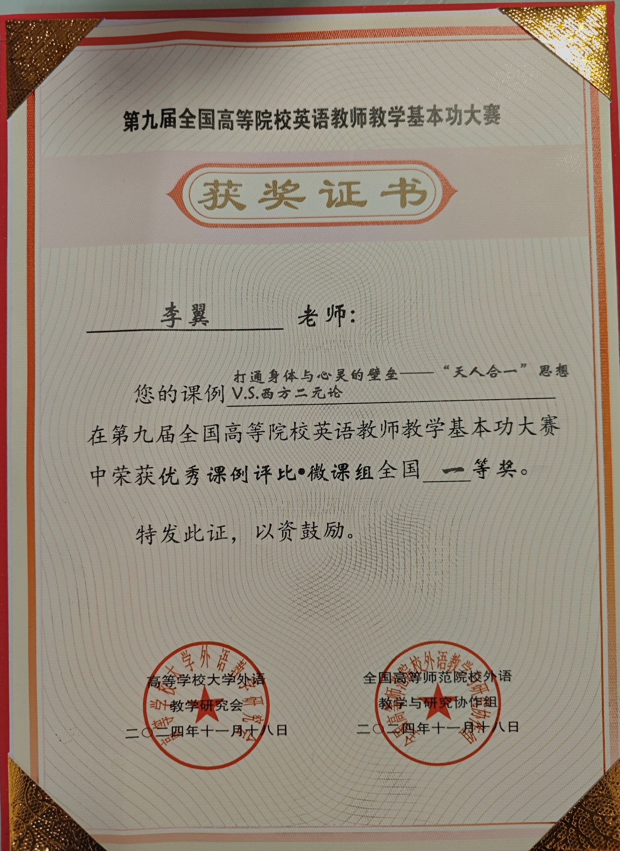 20241118日,全国高等院校英语教学学术年会暨第九届全国高等院校英语教师教学基本功大赛在江城武汉圆满落幕。我校外国语学院英语系专任教师、多语种翻译与国际传播研究中心成员李翼老师在第九届全国高等院校英语教师教学基本功大赛中,凭课例“打通身体与心灵的壁垒——“天人合一”思想V.S. 西方二元论“荣获优秀课例评比·微课组全国一等奖。