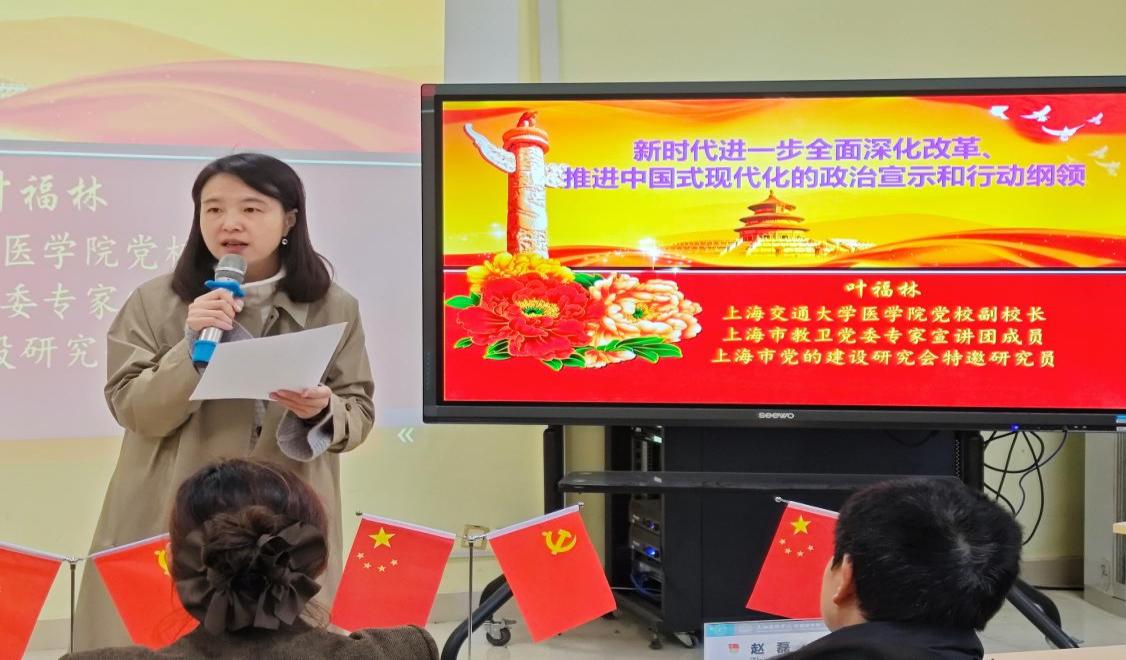 20241121日下午,外国语学院邀请上海交通大学医学院党委组织部副部长、党校副校长、上海市教卫党委专家宣讲团成员、上海市党的建设研究中心特聘研究员叶福林教授,为学院全体学生党员、入党积极分子做党的二十届三中全会精神学习辅导报告,活动由学院党委书记杜鹃主持。