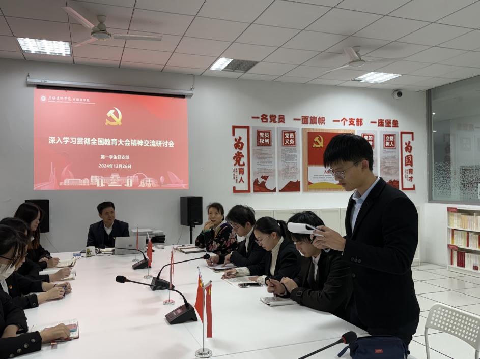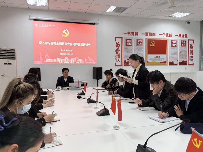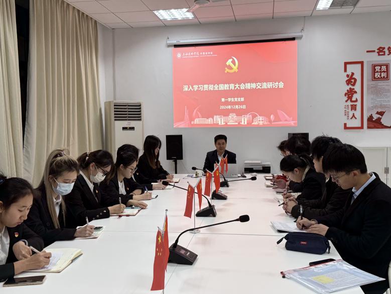 为深入学习贯彻全国教育大会精神,12月26日下午我校展开“同上一堂课”党员基本培训,培训结束后外国语学院第一学生党支部在学院303党员活动室开展了围绕“同上一堂课”集中培训主题——《深入学习贯彻全国教育大会精神 挺膺担当 为教育强国建设贡献力量》学习交流讨论的组织生活。会议由党支部书记赵磊主持,支部全体党员参加了此次交流研讨会。