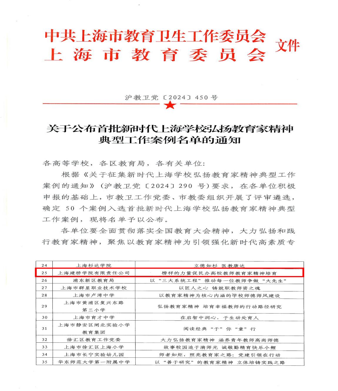 近日,上海市教卫工作党委、上海市教委公布了“首批新时代上海学校弘扬教育家精神典型工作案例”名单。该项目覆盖到全市教育系统,我院申报的《榜样的力量促民办高校教师教育家精神培育》工作案例成功入选。