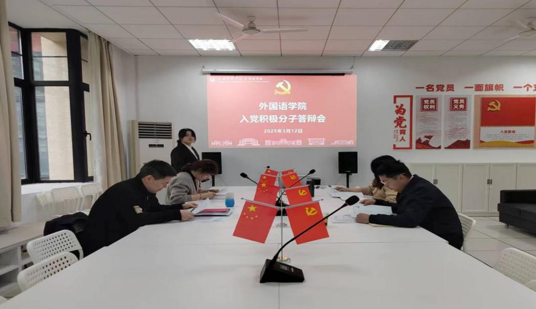 为进一步落实外国语学院入党积极分子的培养工作,提高党员质量,把好党员入关口,2025年3月12日在外院303开展了入党积极分子答辩会。外国语学院党委组织委员刘沛雨、学生支部书记赵磊,方毓锦,吴多发以及支部支委参加了本次答辩会。本次答辩会分为个人汇报和评委提问两个环节。