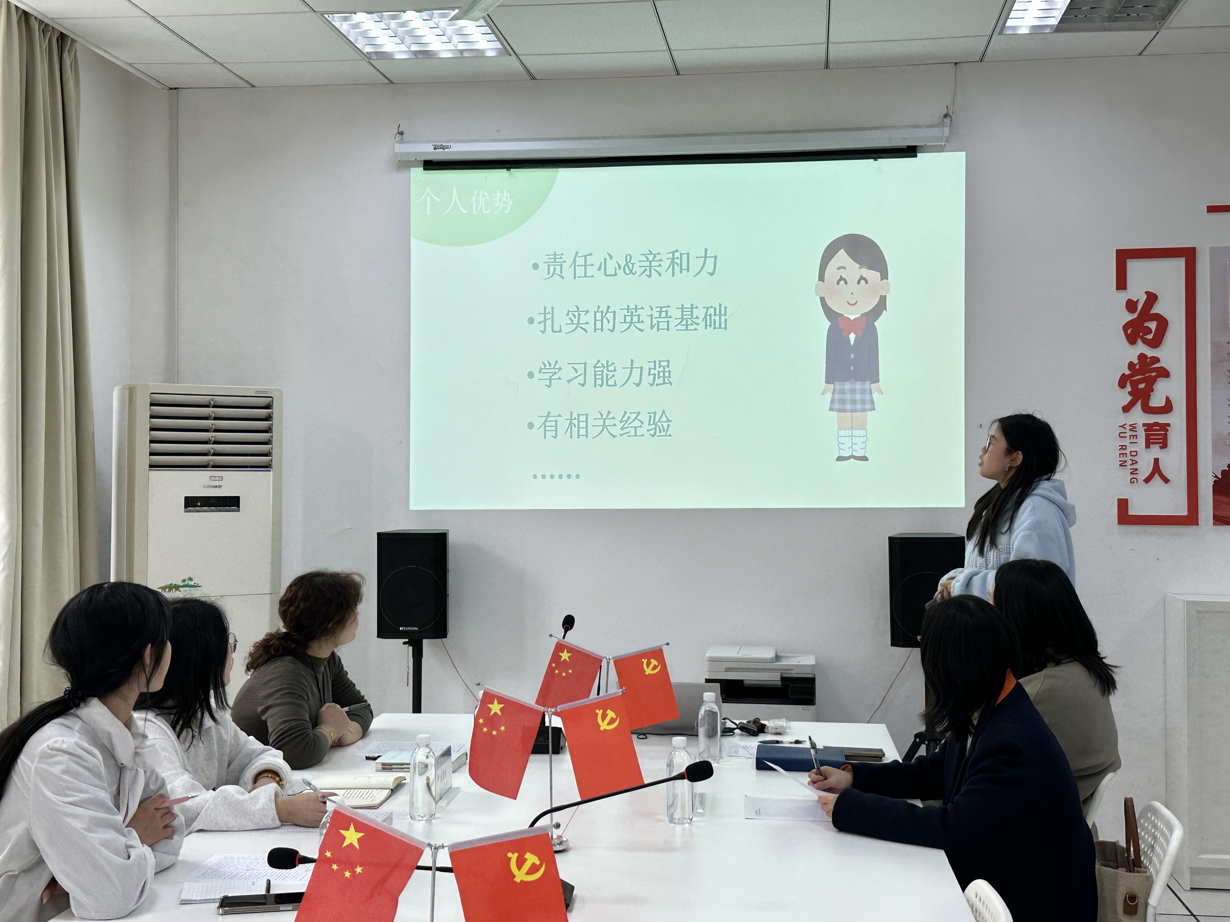 本次面试于学院303党员活动室举行,活动旨在通过趣味英语教学,为社区幼儿打开世界之窗,激发他们对英语的兴趣。出席本次活动的面试人员有:宜浩欧景二居委活动指导教师严蓓、英语系教师王嘉怡、学院党委组织委员刘沛雨,第二期和第三期活动组长杨薏雯、何诗婷。17位怀揣教育梦想与热忱的学生依次入场参加面试,他们准备充分,通过英文儿歌、趣味故事等形式充分展现扎实专业素养与投身公益的决心。面试人员从教学能力、亲和力、沟通技巧等多维度严格把关,与学生深入沟通,针对教学理念、课堂互动、幼儿心理引导等问题展开细致交流。严蓓老师也从往期活动现场易突发的情况对学生们进行提问并引导解决,学生们认真作答,虚心接受建议,现场氛围轻松又活跃。