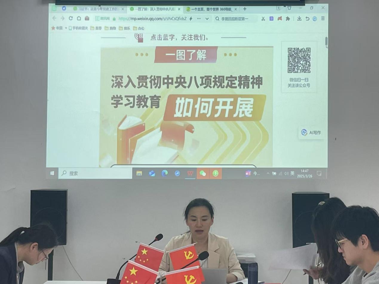 最后,支部副书记侯健慧对深入贯彻中央八项规定精神学习教育工作进行了动员部署。侯健慧强调,开展深入贯彻中央八项规定精神学习教育是今年党建工作的重点任务,要把开展学习教育同贯彻落实学校党委战略部署和全年工作要点有机结合起来,进一步强化纪律意识,切实改进工作作风,以优良的作风推动支部各项工作落实。侯健慧指出,开展学习教育,要坚持聚焦主题、简约务实,不分批次、不划阶段,一体推进学查改,融入日常、抓在经常,切实在学习研讨、查摆问题、集中整治、开门教育上下功夫,确保学有质量、查有力度、改有成效。三月到七月期间,支部将通过专题学习、案例剖析、自查自纠等多种形式,深入开展学习教育工作,党员同志要将学习教育成果转化为推动工作的强大动力,以更加饱满的热情、更加务实的作风,积极投身到教学、科研工作中,为学校和学院的高质量发展贡献力量。