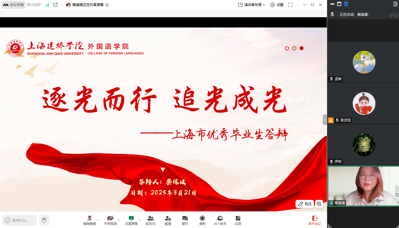 为彰显优秀学子的示范引领作用,引导大学生树立正确的成长观与职业观,3月21日上午,外国语学院2025届优秀毕业生答辩会于线上顺利召开。学院奖助评定工作领导小组成员伊莉、刘沛雨和孟娣担任评委,会议由易贤恒主持。