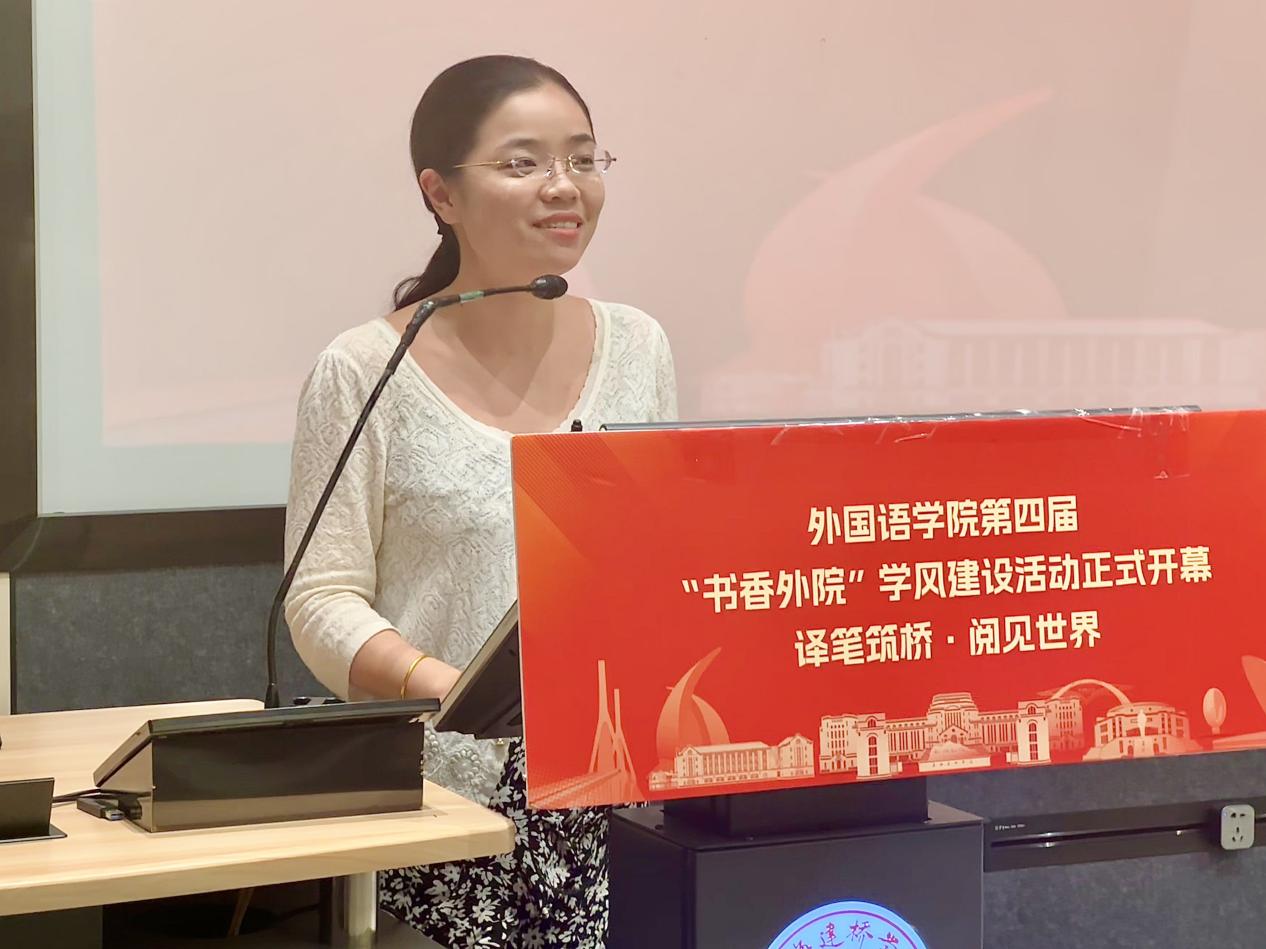 2025年5月22日下午13:30,外国语学院第四届“书香外院”学风建设活动开幕式在三教220教室举行。本次活动以“译笔筑桥,阅见世界”为主题,旨在厚植学院学风建设根基,营造馥郁浓厚的读书氛围,为师生搭建阅读与成长的桥梁,活动由党委副书记伊莉老师主持。