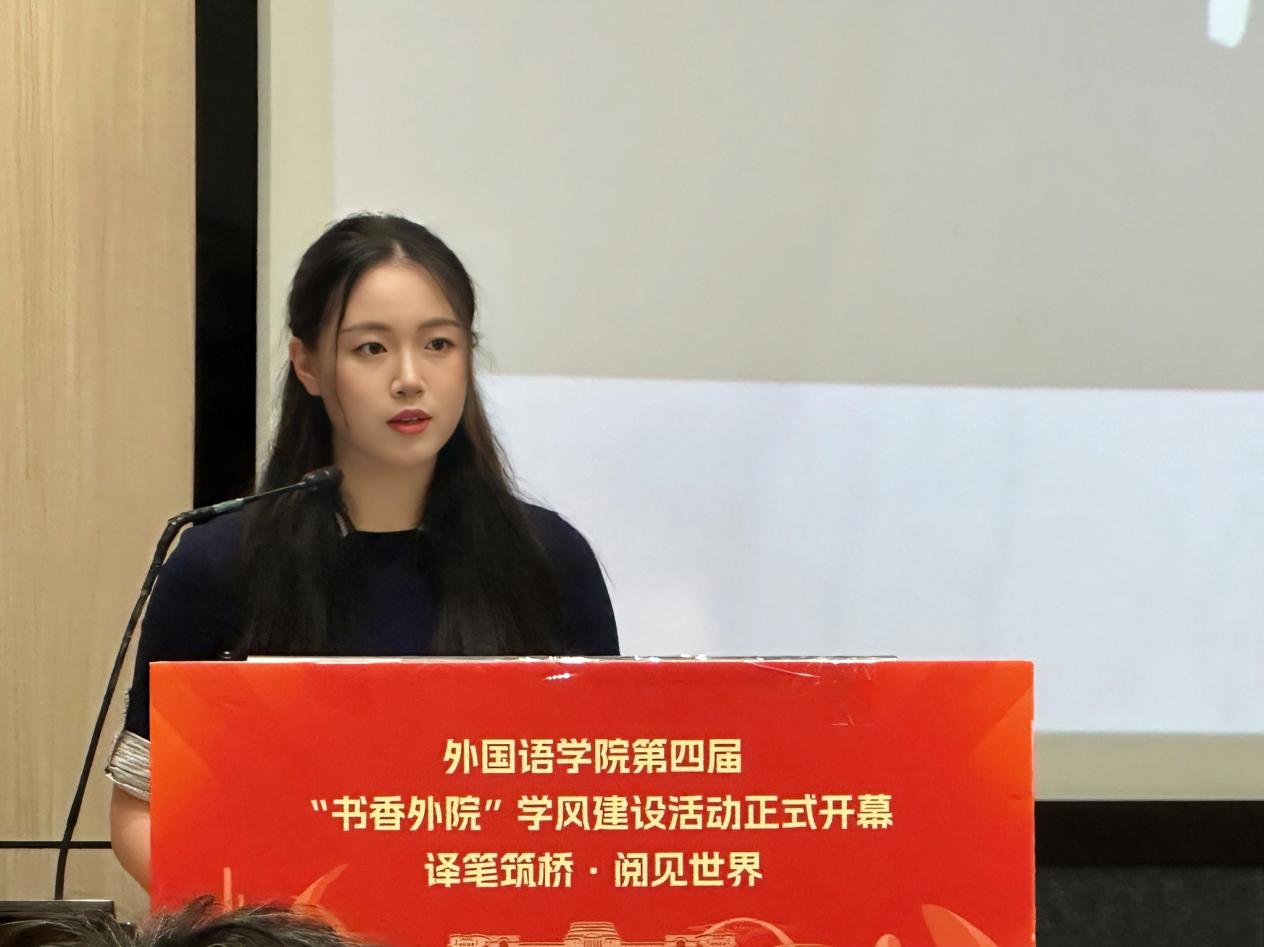 开幕式伊始,上海建桥学院学生处副处长高雅老师发表了诚挚的致辞。她充分肯定了外国语学院在学风建设方面取得的成就,并着重强调阅读是学生成长成才的重要基石,鼓励同学们把书籍当作终身挚友,在字里行间中不断汲取养分,充实自我,为未来的发展筑牢根基。