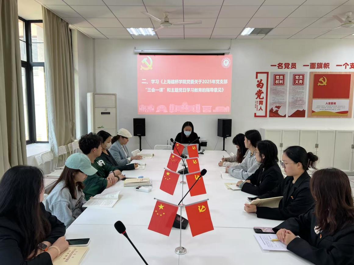 随后,孟娣根据《上海建桥学院党委关于2025年党支部“三会一课”和主题党日学习教育的指导意见》文件精神,结合本支部实际情况,对上半年组织生活进行部署。她强调,要深刻把握“学思用贯通、知信行统一”的要求,将常态化学习作为锤炼党性的基石,既要通过“三会一课”、主题党日深化理论武装,也要在服务师生、社会实践中推动学习成果转化,以“学在日常、做在经常”的姿态彰显党员先锋本色。