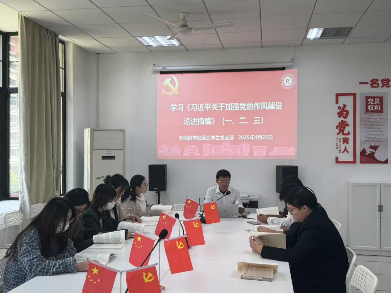 为持续深入学习贯彻习近平总书记关于加强党的作风建设的重要论述,进一步加强支部组织建设,提升党员党性修养,2025年4月25日下午,外国语学院第三学生党支部组织开展了《习近平关于加强党的作风建设论述摘编》(一、二、三)专题学习活动。本次活动由第三学生党支部书记吴多发主持,支部全体党员参加会议。