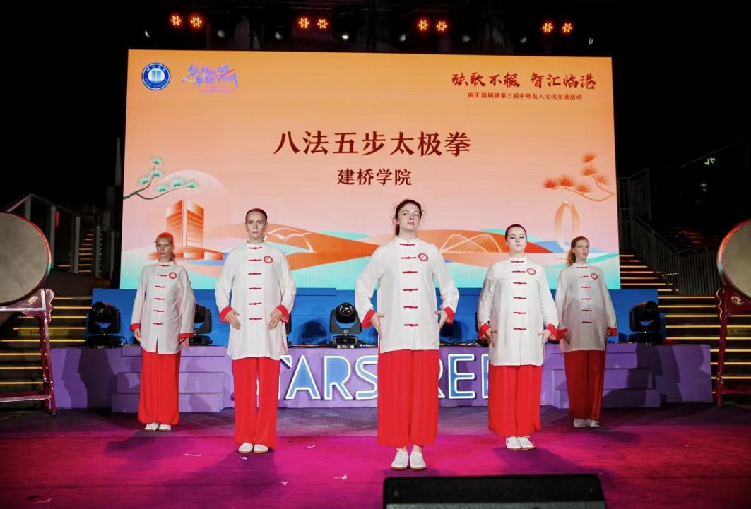 我院的五名国际学生——Alena Gorashchenko、Liudmila Korenkova、Alina Vereikina、Sofiya Semenova和Polina Koniaeva,身着由我院学生Symbat Termirkhan自己设计的特色服装,为现场观众带来了一场精彩绝伦的八法五步太极拳表演。她们的动作如行云流水,舒缓而蕴含内力,将太极拳的刚柔并济、形神合一展现得淋漓尽致。团队成员们默契十足,一招一式整齐划一,在动静开合之间,不仅传递出太极的哲学韵味,更以饱满的精神面貌和富有感染力的表演,赢得了现场观众的阵阵掌声。