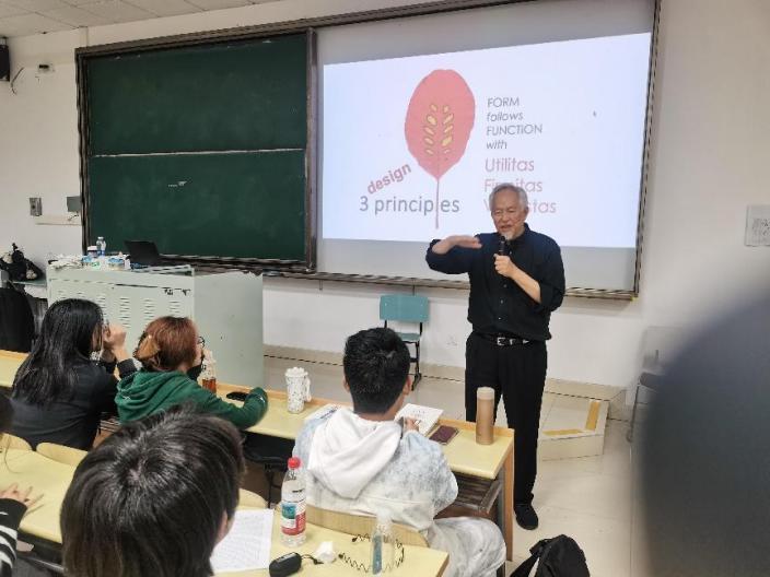 讲座全程以英文进行,林国桢先生结合自身丰富的职业经历,深入浅出地阐述了“形随功能”这一设计理念的核心内涵,并通过多个经典设计案例,展示了如何在实际项目中实现功能与美学的完美融合。他的讲解不仅拓宽了同学们对设计行业的认知,也激发了大家对跨文化交流与国际视野的思考。