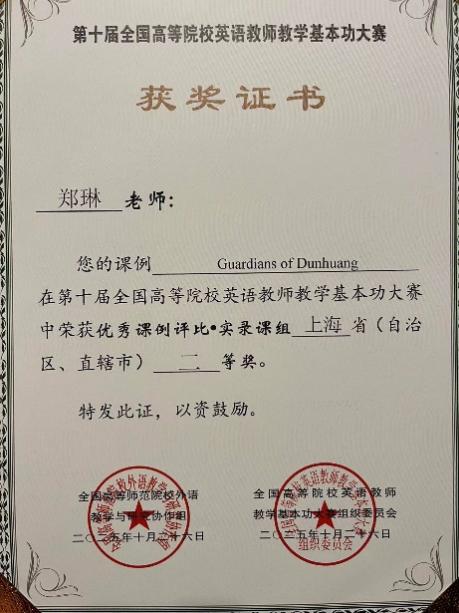 近日,第十届全国高等院校英语教师教学基本功大赛优秀课例评比结果揭晓。我校外语与国际教育学院大学外语部郑琳老师凭借其出色的教学设计与扎实的课堂基本功,荣获大学英语组省级二等奖,展现了我校青年教师卓越的教学风采。