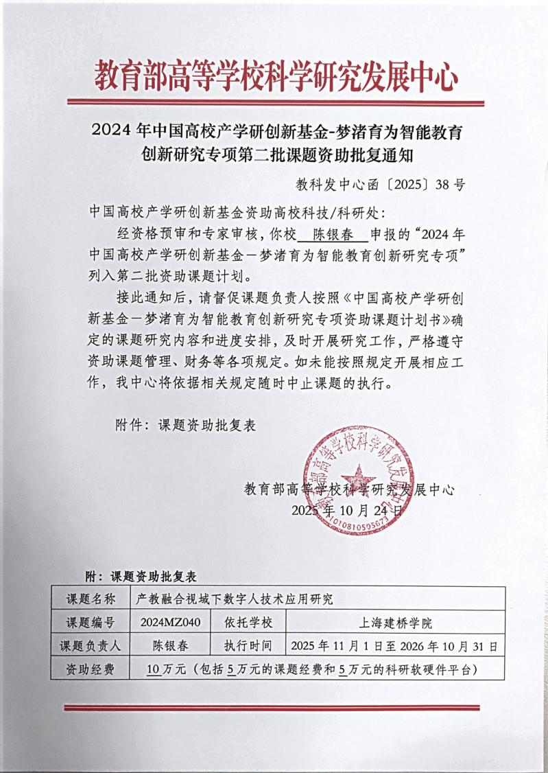 近日,教育部高等学校科学研究发展中心正式发布《2024年中国高校产学研创新基金 -梦渚育为智能教育创新研究专项第二批课题资助批复通知》(教科发中心函〔2025〕38号)。我校陈银春教授带领团队申报的课题成功入选第二批资助课题计划,获批课题经费与科研软硬件平台支持共计 10万元,这是学校在产学研融合研究领域取得的重要突破。