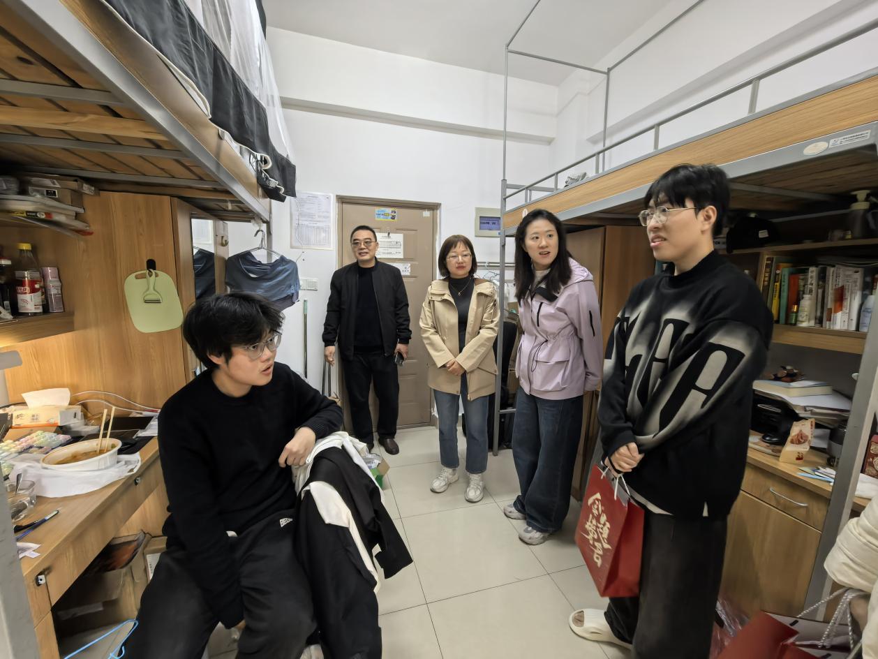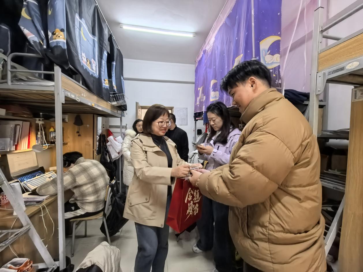 2025年全国硕士研究生考试在即,为给备考学子舒缓压力、鼓舞士气,2025年11月24日,外语与国际教育学院党委书记王晨岑、副书记徐伟带领毕业班辅导员深入学生寝室,亲切看望慰问正在备考的学子,并为他们送上学院的温暖关怀与“考研加油包”。
