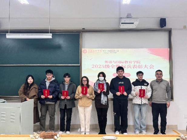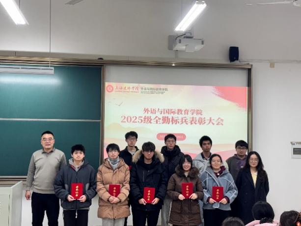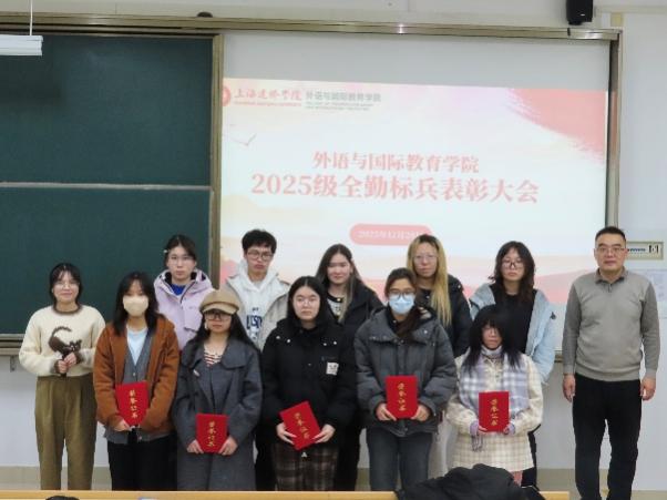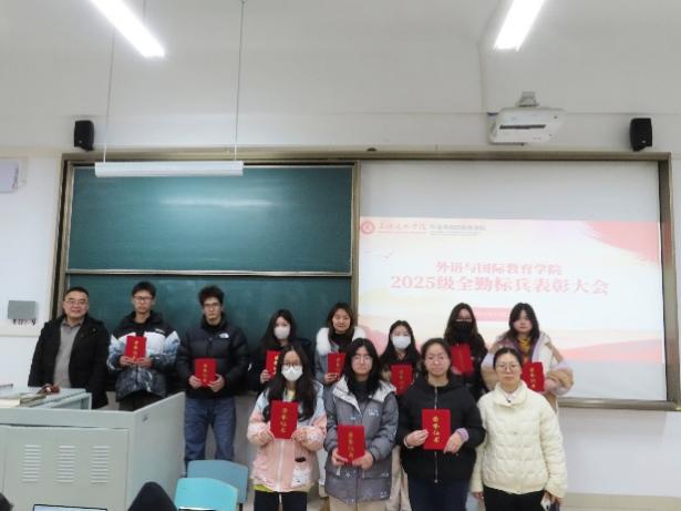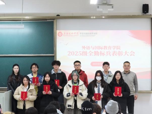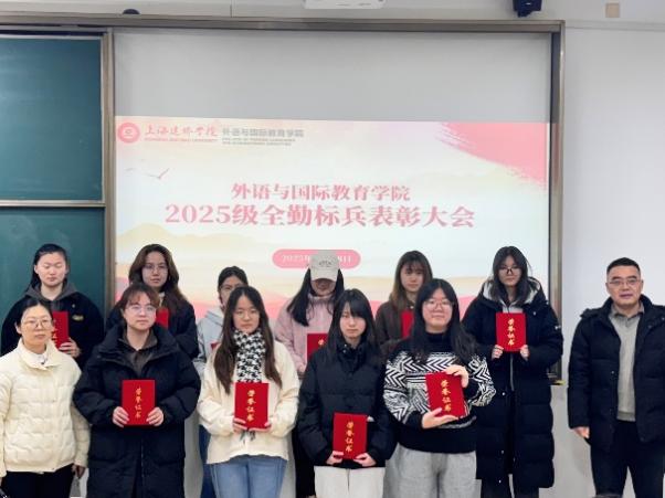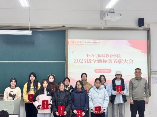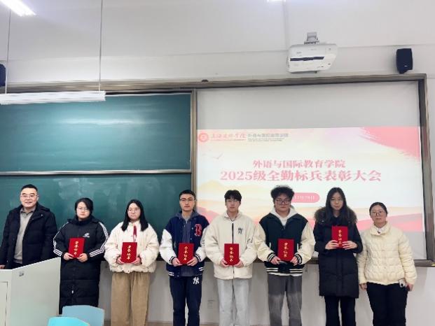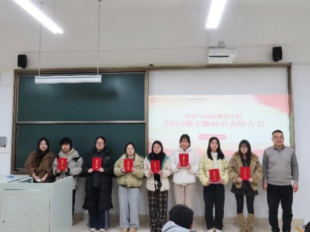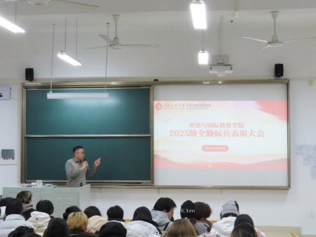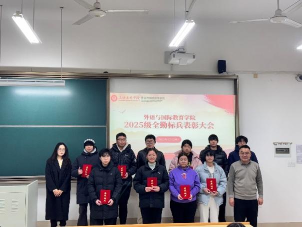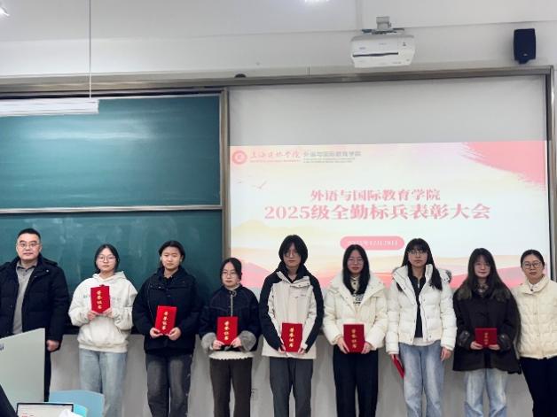 为表彰先进、树立学风典范,激励2025级新生涵养勤学自律品格,12月28日晚,外语与国际教育学院在新生晚自习教室隆重举行“全勤标兵”颁奖典礼。学院党委副书记徐伟、2025级年级组长刘志霞、全体辅导员及大一新生共同参与,见证榜样风采,汇聚奋进力量。