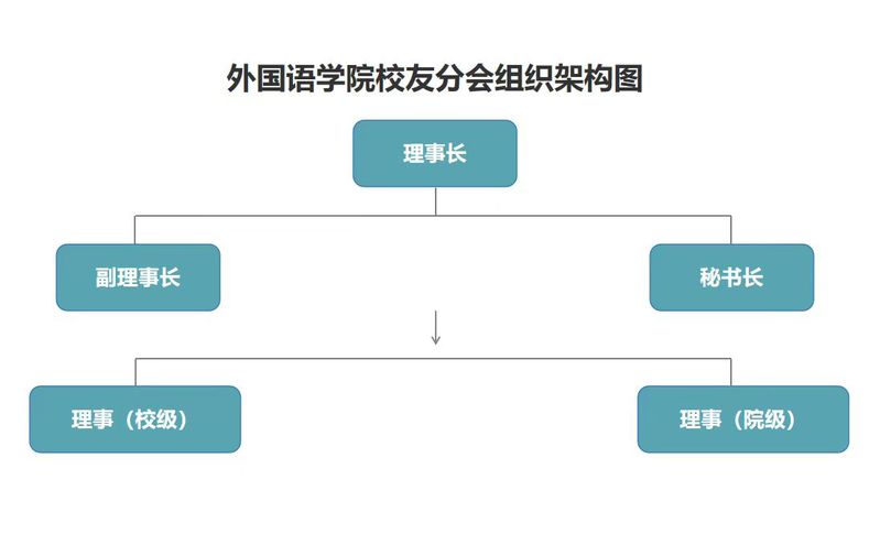 外国语学院校友分会由院党委书记杜鹃任理事长,院党委副书记伊莉任副理事长,外国语学院朱心怡任秘书长,下设3位校级理事,3位院级理事。本会旨积极加强校友与母校,校友及校友之间的联系、团结与合作,